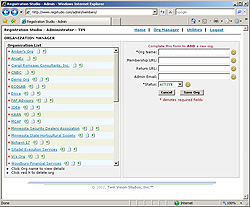 Registration Studio was developed by and is solely owned by Twin Vision Studios, Inc. It allows clients to create customized online registration web sites. The system uses a complex administrative system to allow users to customize their events with sessions, locations, lodging, real-time credit card ecommerce and member management.